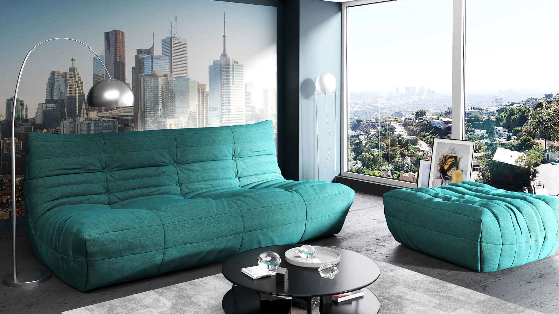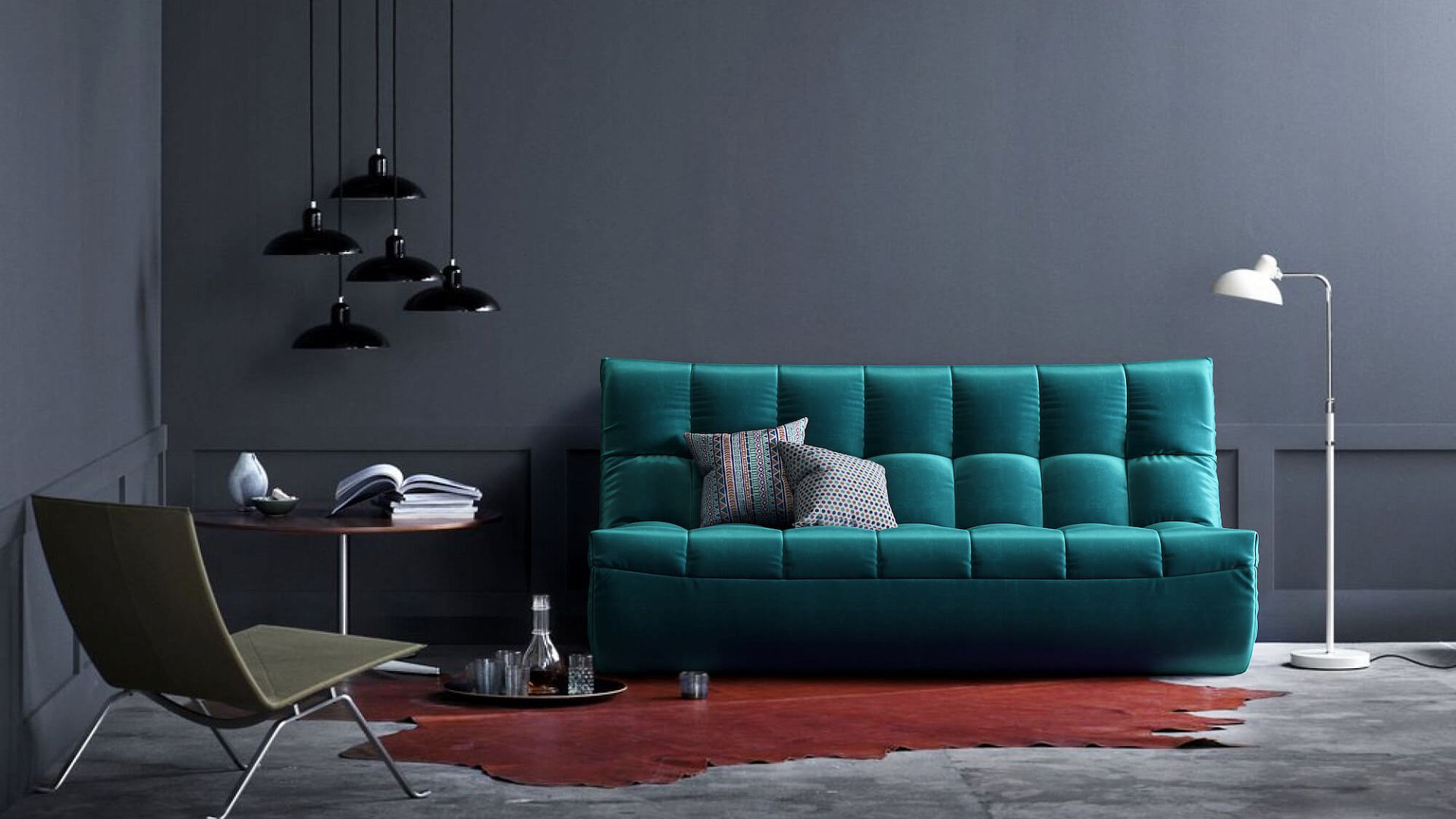 Бирюзовый диван в сером интерьере