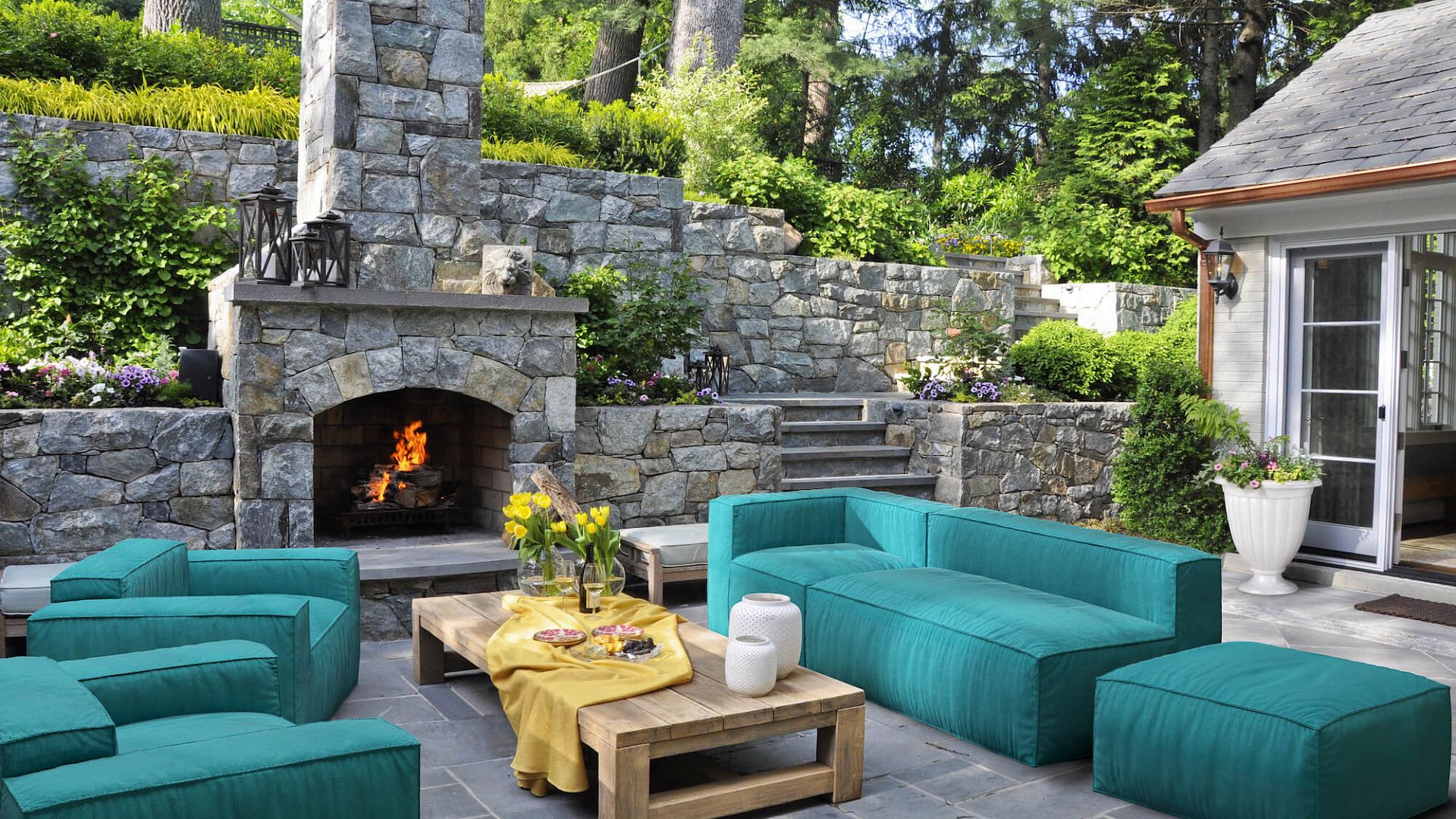 Дерево, зелень, беж, оттенки серого - все это дополняет и успокаивает активные бирюзовые оттенки.