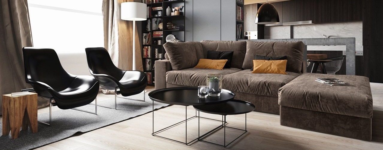 Прямой диван с мягкими модулями одинаково хорош как для просторных, так и для малокалиберных комнат. Таким диванам отлично подходят любые интерьеры: и кухня, и гостиная, и спальня. К тому же они отлично разделяют зоны: например, кухонную от гостиной.