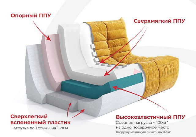 Высокоэластичные пены, из которых сделан ДеФранс, подобраны инженерами, исходя из математических расчетов распределяемой нагрузки на каждую деталь кресла. Благодаря надежным материалам и точному инженерному расчету, готовый диван прослужит максимально долго без потери основных свойств и без деформации.