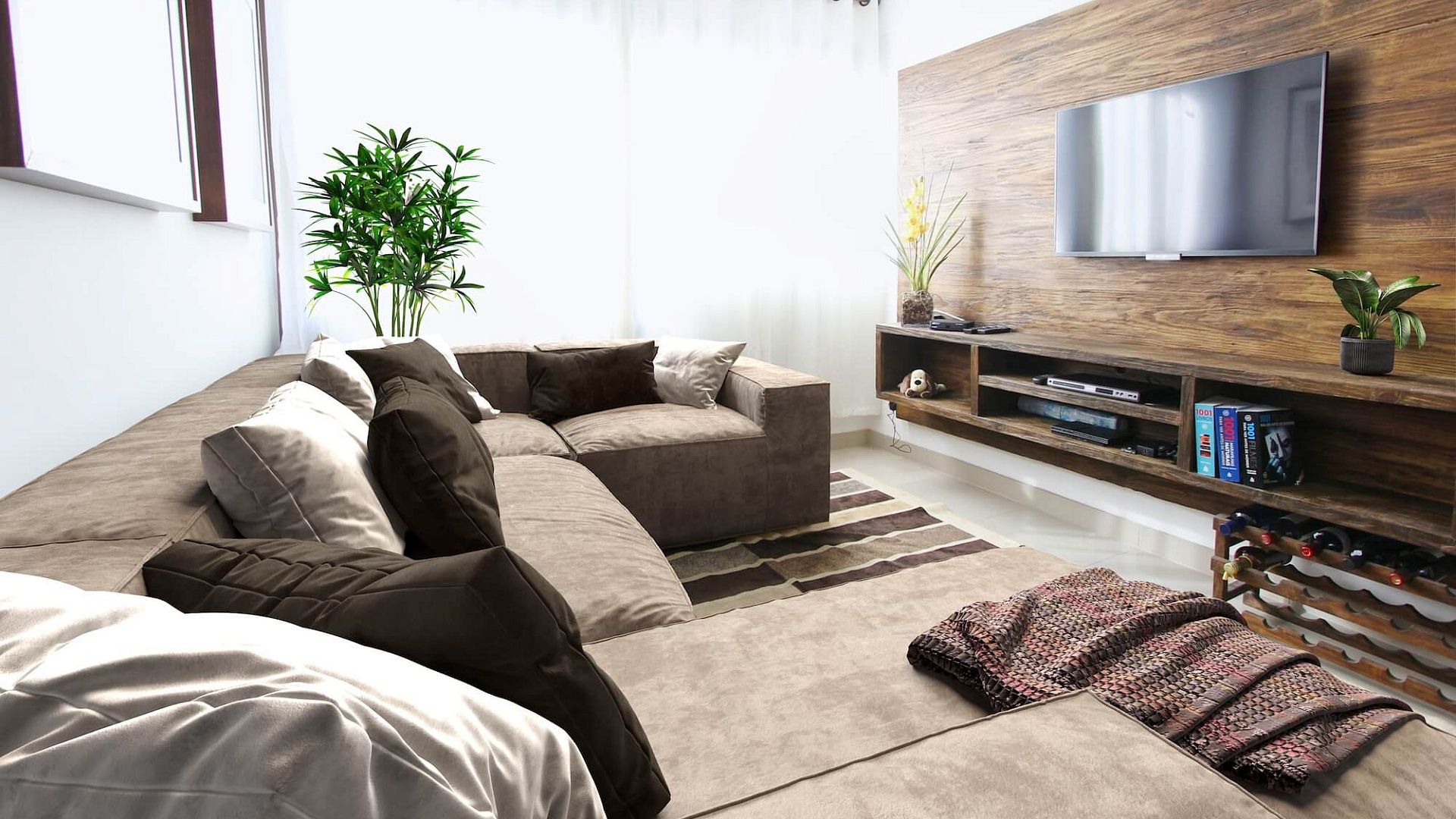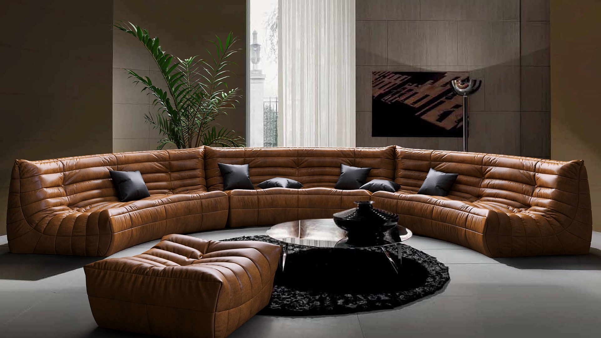 Строгий и стильный диван для зонирования комнаты и угловых эркеров.
