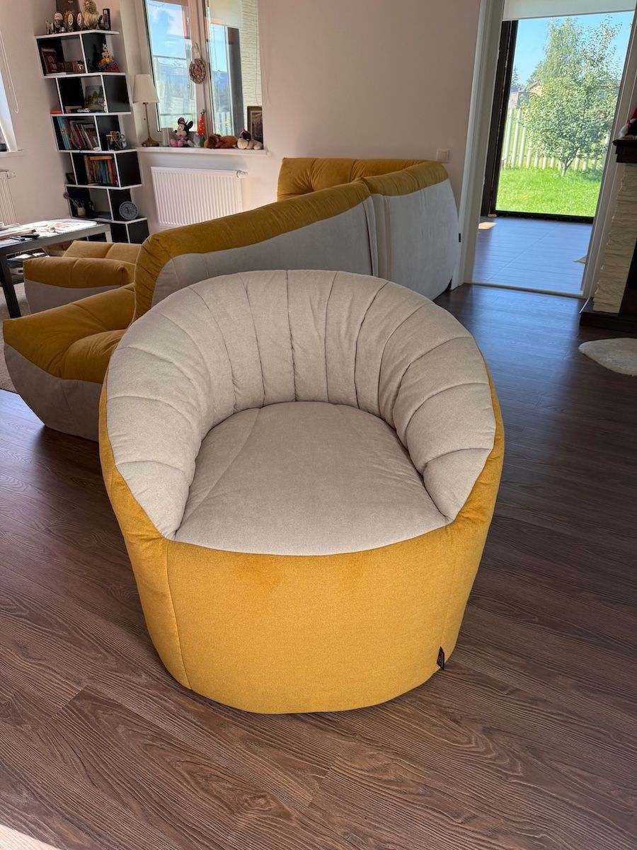 Случился ремонт квартиры с выкидыванием старой мебели, и возник вопрос создания достаточно удобного места для просмотра фильмов. И очень не хотелось покупать стандартный диван - душа требовала чего-то более необычного. И это самое необычное, приглянулось в каталоге компании Gliver. Конфигурация комнаты не позволяет поставить длинный диван, поэтому, было решено "убить двух зайцев". Были выбраны 2 кресла "Дефранс" с чуть уменьшенной шириной относительно стандартных предложений, и 2 пуфа к ним, на которые удобно закидывать ноги. Так как, вся мебель перемещаема, можно поставить небольшой столик, и устроиться вчетвером.